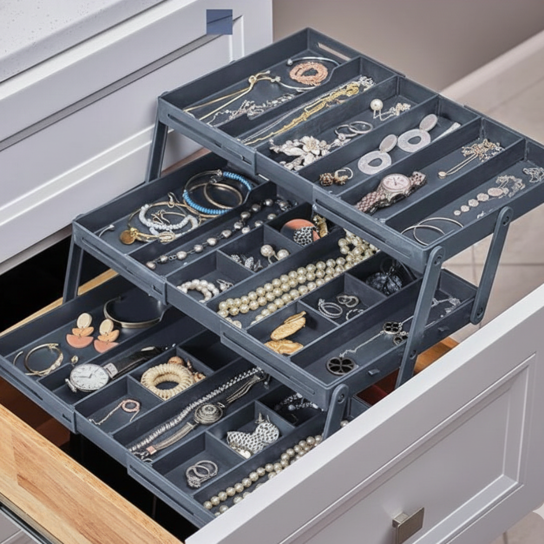 Optimiza tu espacio con nuestro organizador expandible de tres niveles, diseñado para brindarte máxima funcionalidad y adaptación. Perfecto para organizar joyas, maquillaje, productos de cuidado personal, elementos de oficina y herramienta. Este organizador es la solución ideal para mantener todo en su lugar sin ocupar espacio innecesario.