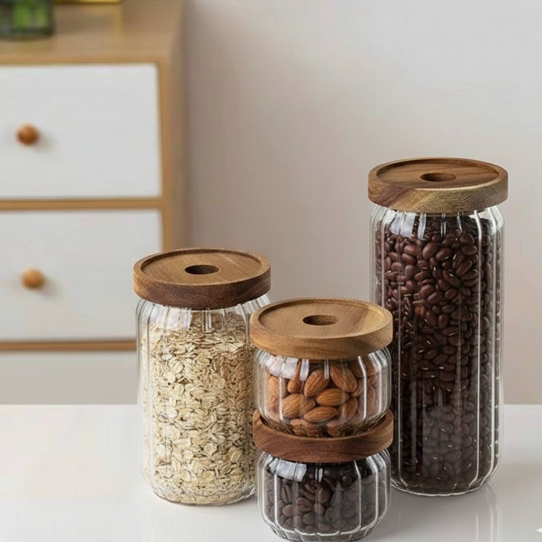 SET DE 4 TARROS EN VIDRIO CON TAPA HERMÉTICA PARA LA DESPENSA