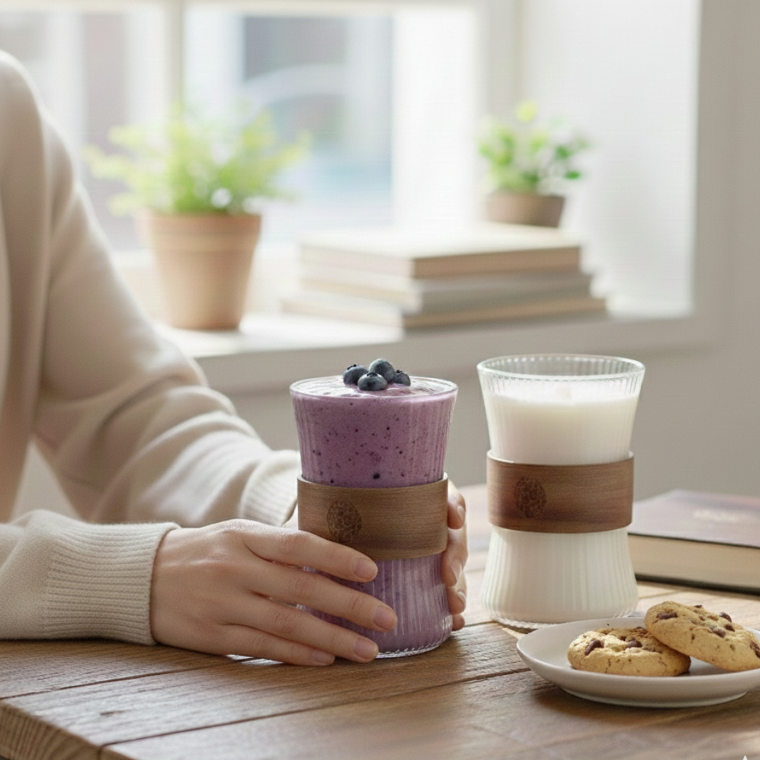 Descubre el Set de 2 vasos de vidrio acanalado con un toque de calidez natural. Cada sorbo se convierte en un momento especial. Su diseño premium no solo es hermoso, sino funcional: incluye una funda aislante removible en madera que protege tus manos del calor y le da un estilo sofisticado inigualable.