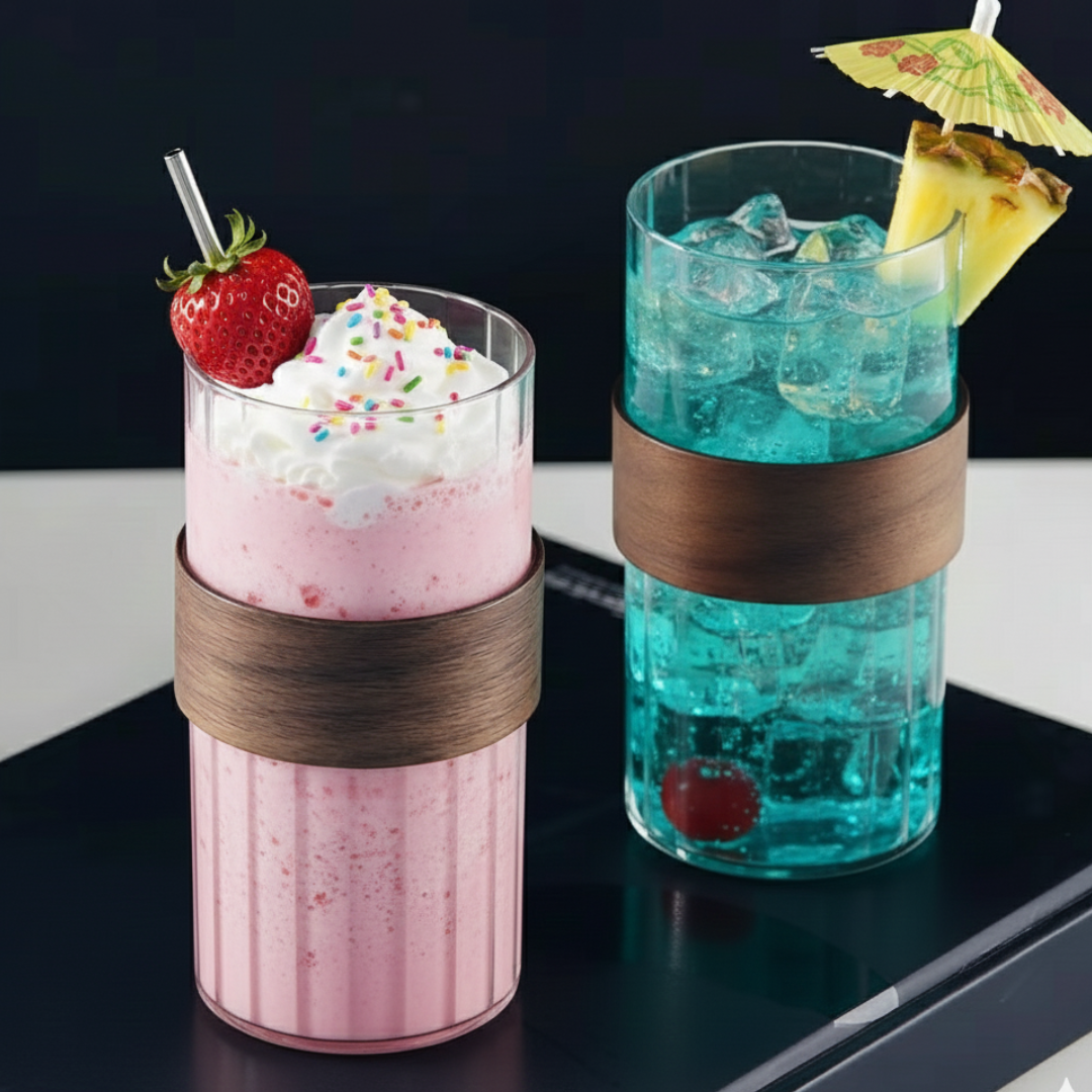 Banda de Madera Natural: Cada vaso está adornado con una banda de madera oscura que no solo proporciona un contraste estético único y un toque rústico-chic, sino que también sirve como aislamiento térmico, haciendo el agarre más cómodo para bebidas frías o calientes
